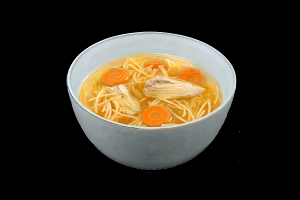 0,33 l, koreňová zelenina (mrkva, petržlen), varené kuracie mäso, rezance